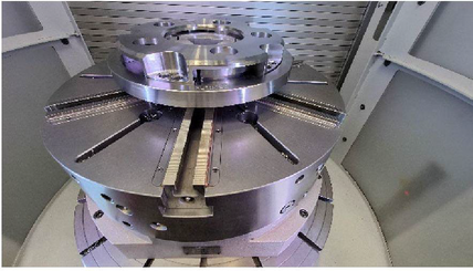 „Gespannt werden die Bauteile außerhalb der Maschine. Infolgedessen gibt es keine Nebenzeiten für den Spannvorgang in der reinen Fertigungszeit“, betont Röhm Sales Engineer Thorsten Nolte. „Das Futter wird auf der Palette mittels Zapfen zentriert, über Nutensteine lageorientiert sowie mittels Schrauben und Nutensteine befestigt. Die Werkstücke werden ins Spannfutter geladen und in einem Regal bis zur Fertigung zwischengelagert.“